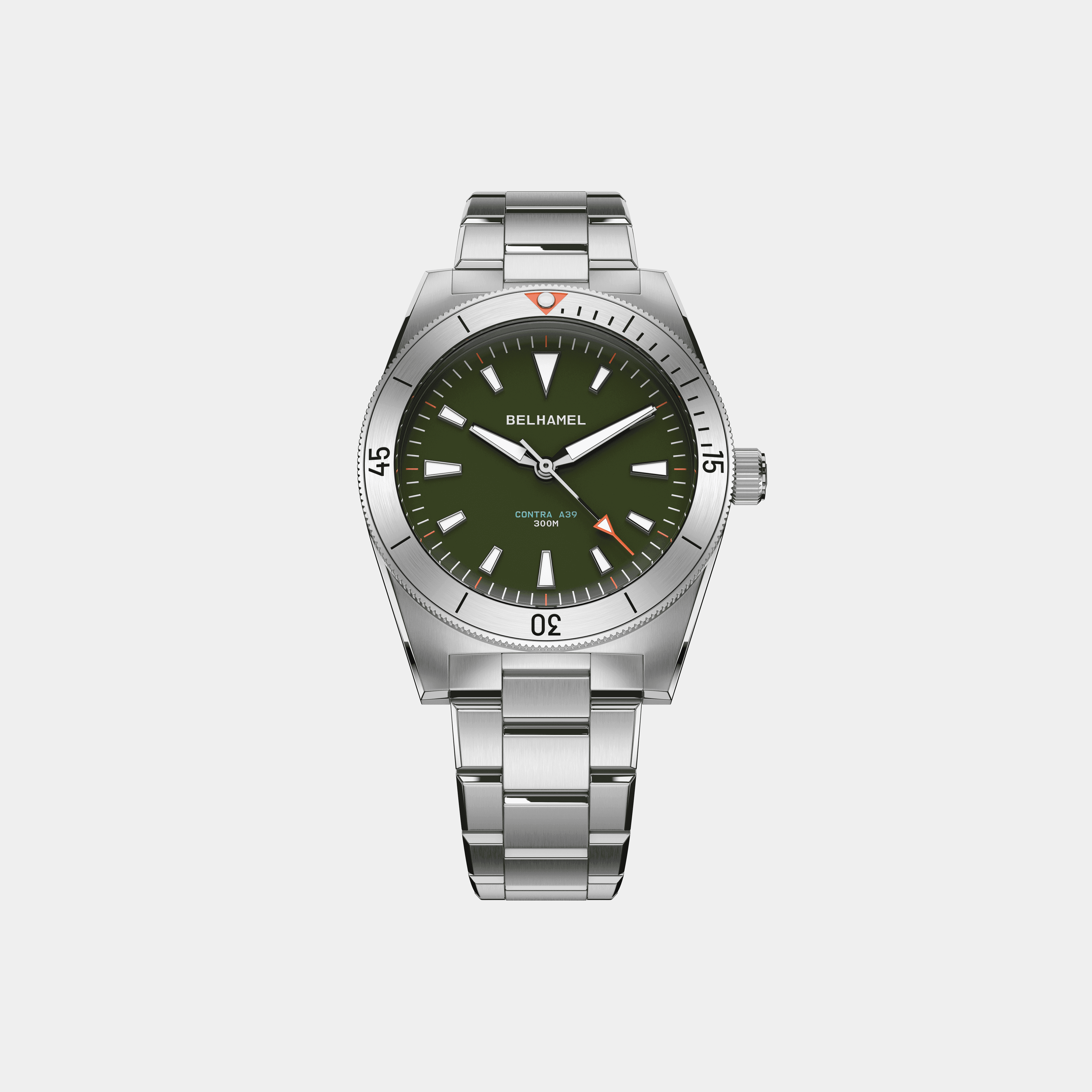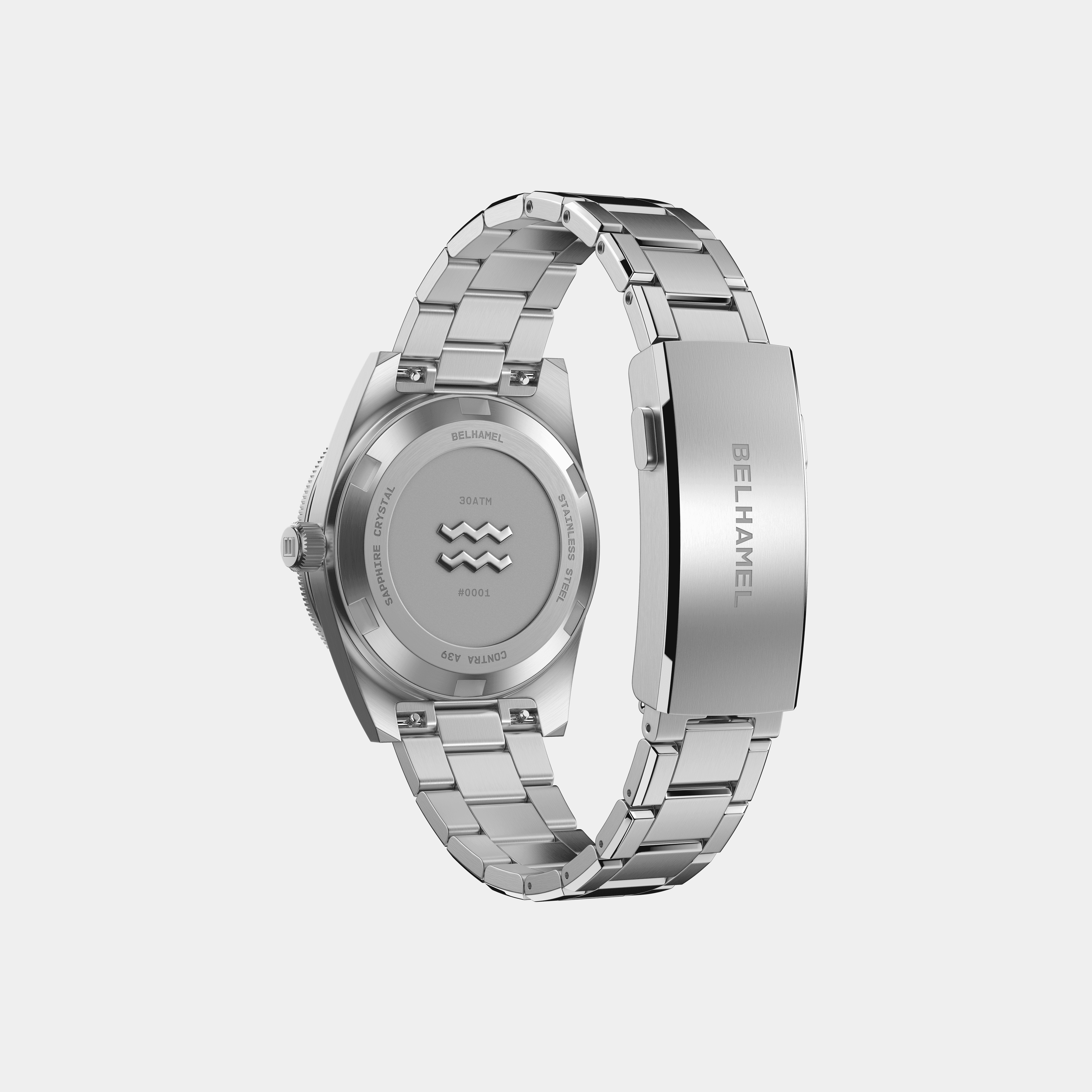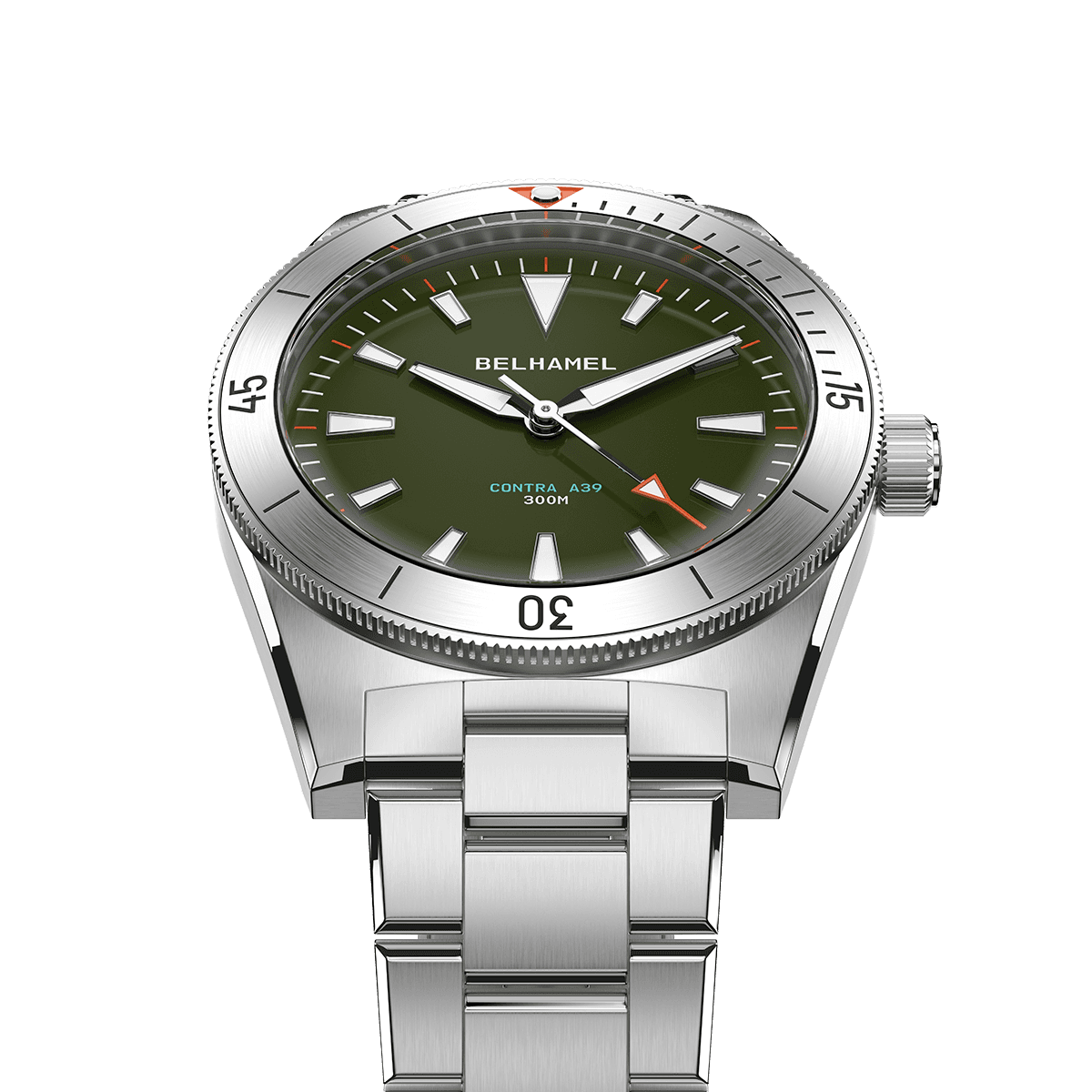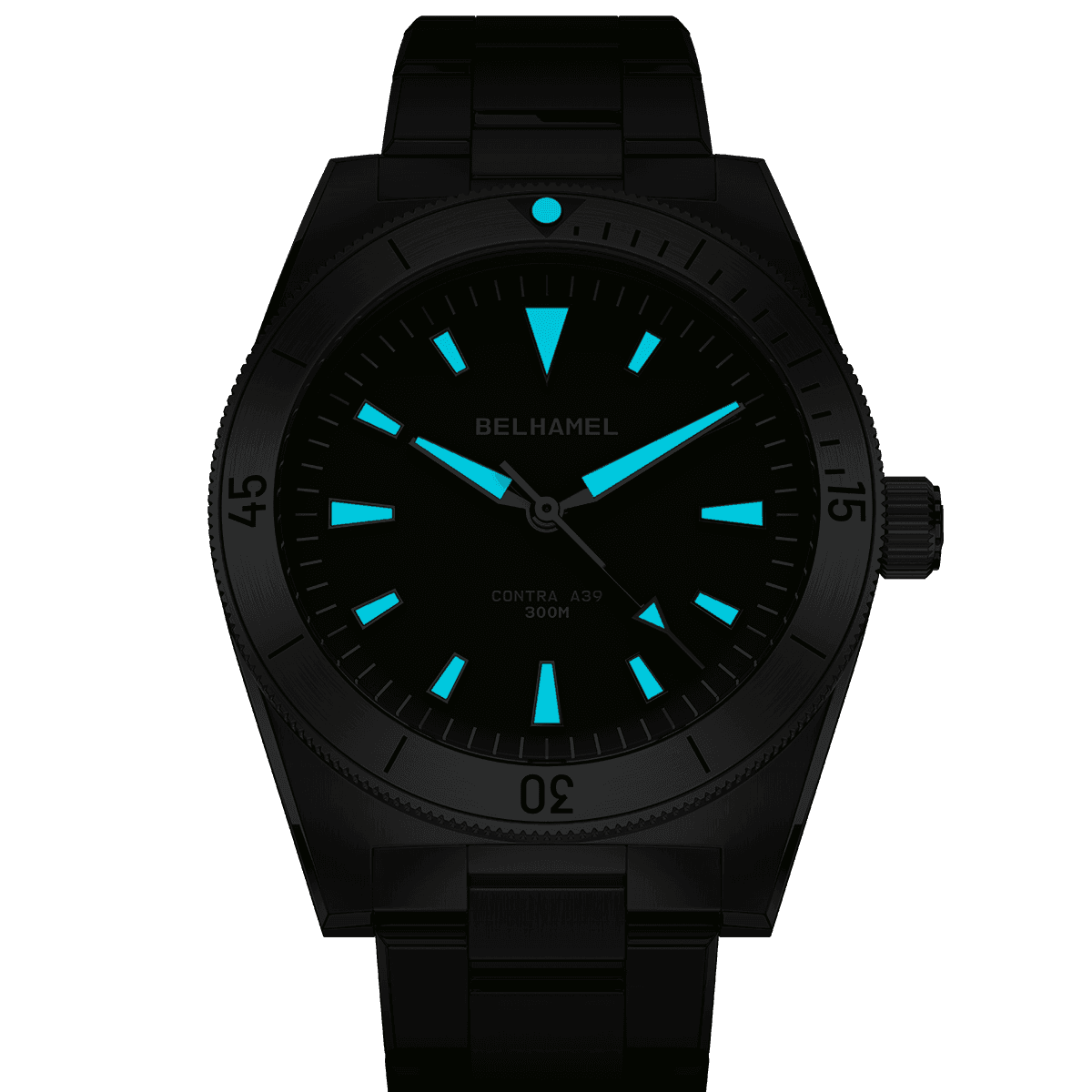 This high-performance movement is housed in a marine-grade 316-L stainless steel case with 900-1100 HV hardness and a 30 ATM depth rating. This watch can take a beating, and with its finely polished chamfers, it's equally pretty as sturdy. The Contra A39 measures 39mm in diameter, 47mm lug-to-lug, and 12mm thick, offering a balanced and comfortable fit.