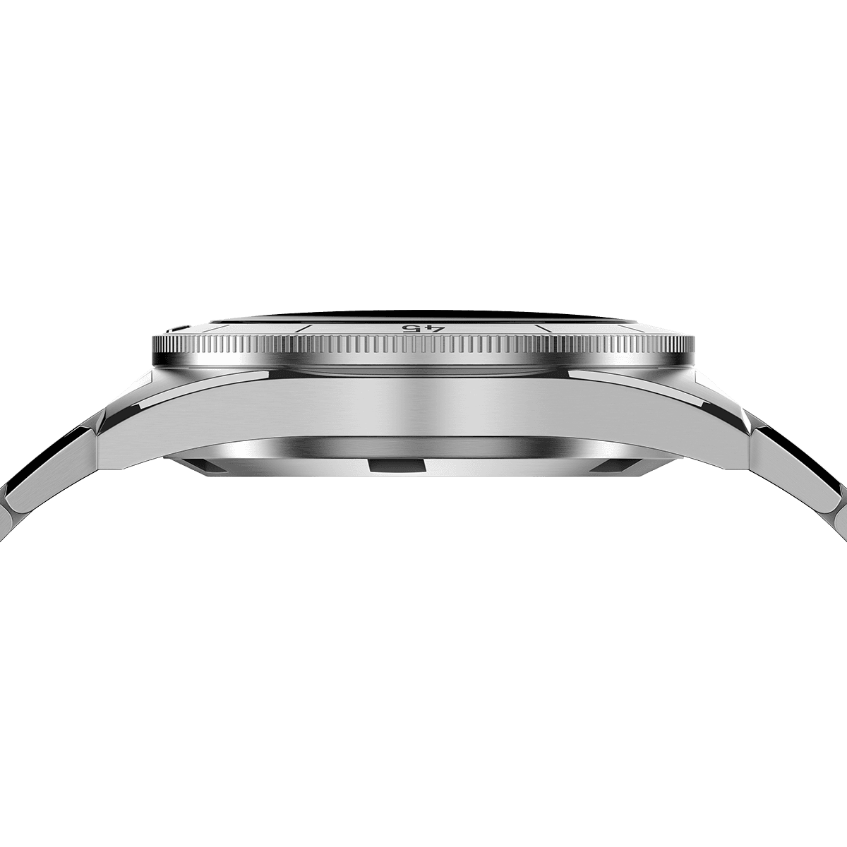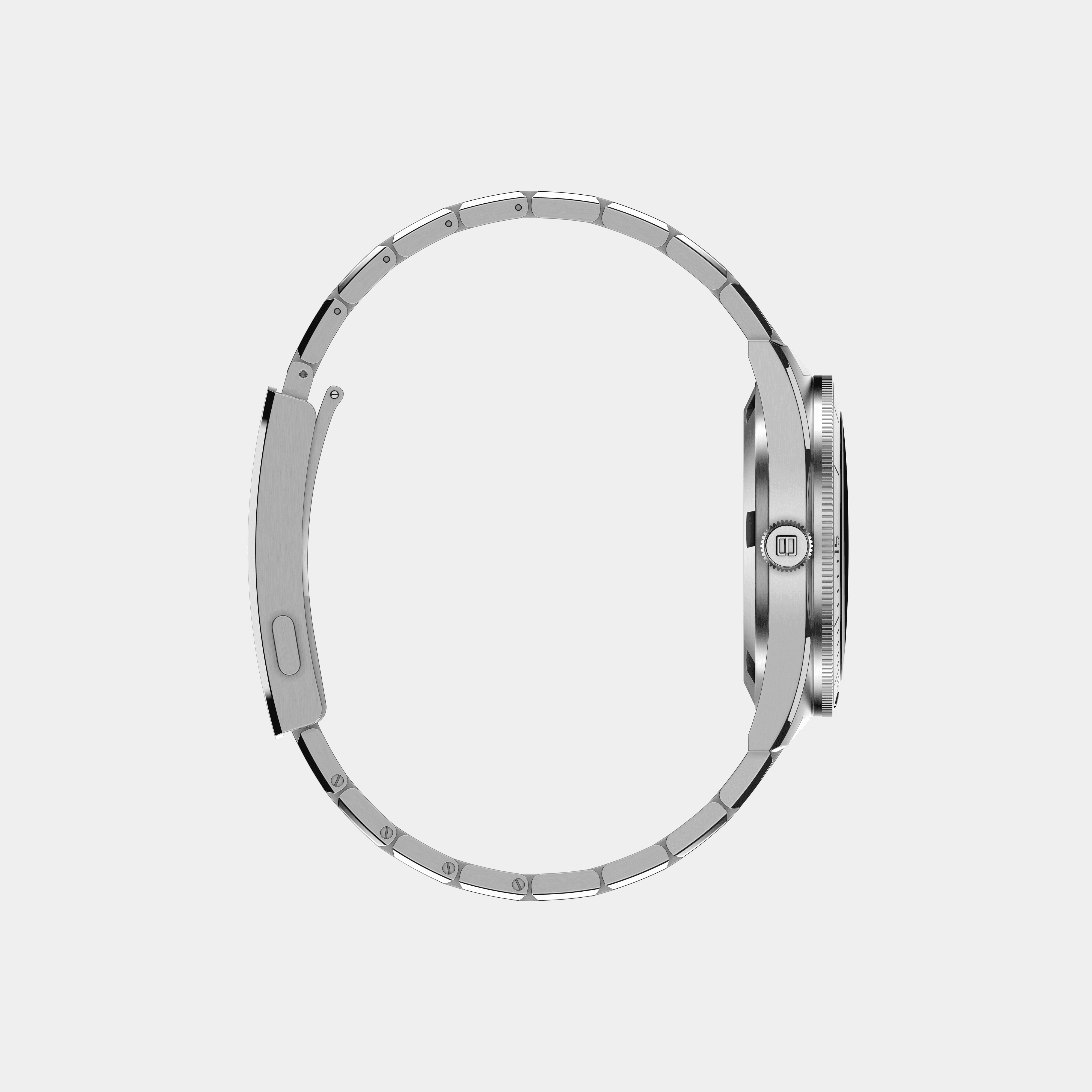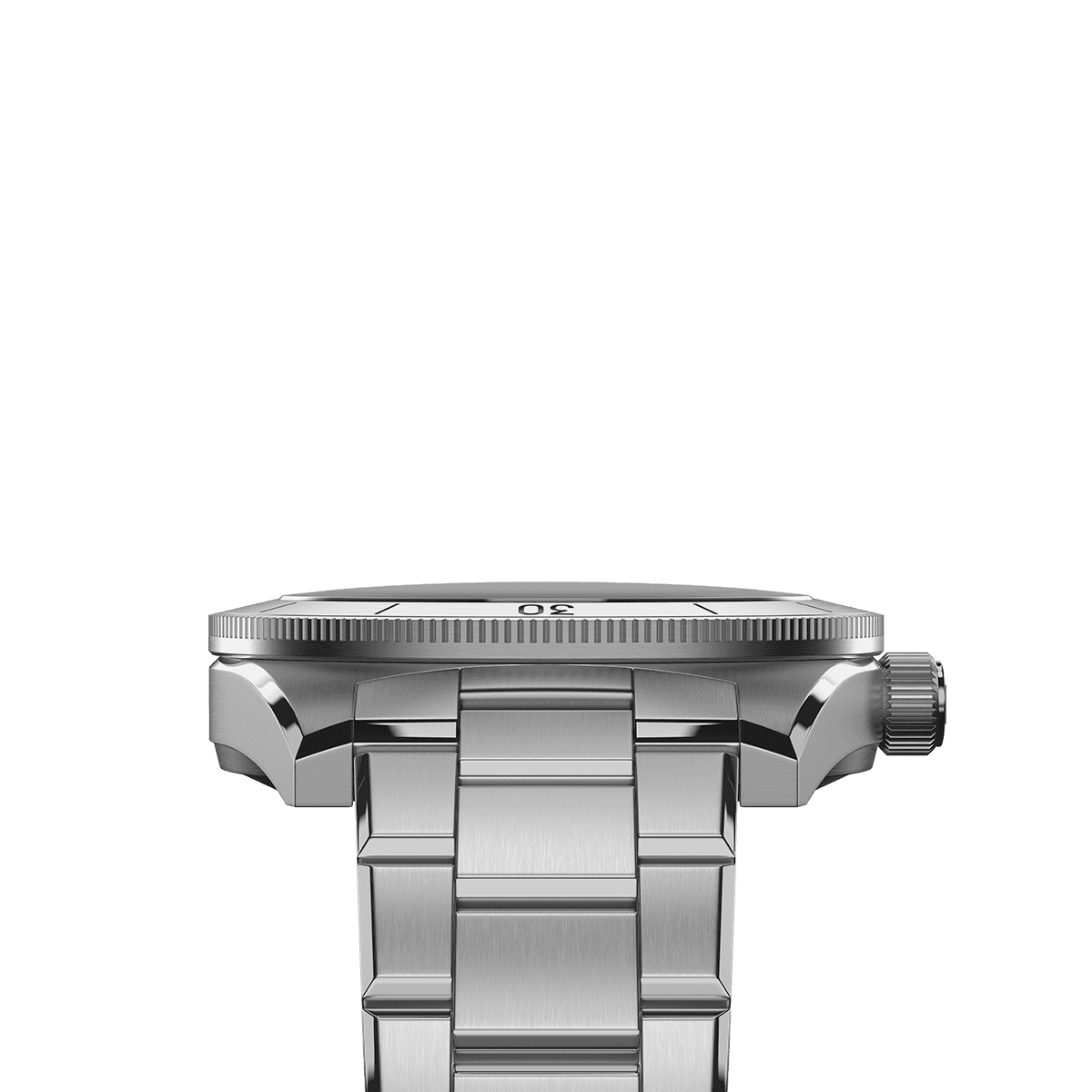 The tapered bracelet (20 to 16mm) matches the durable case, with each link hand-finished to showcase brushed surfaces and polished chamfers. The bracelet gives an integrated look and includes a milled push-button, micro-adjustable signed clasp, ensuring a secure fit regardless of wrist size. Bracelet changes are easy with 2mm quick-release spring bars.