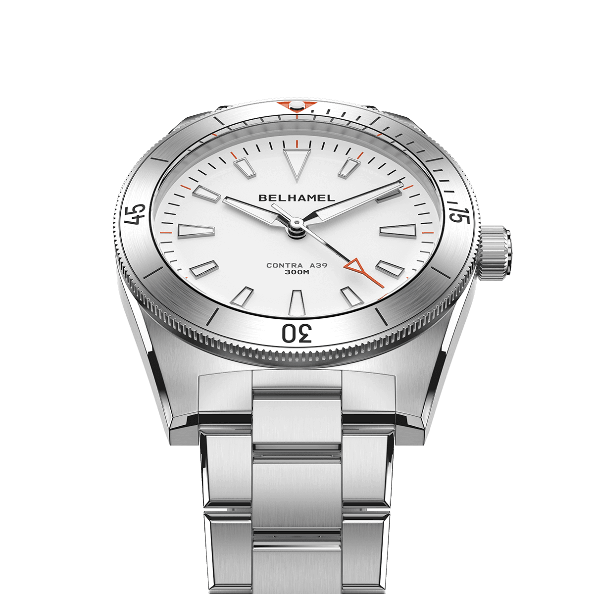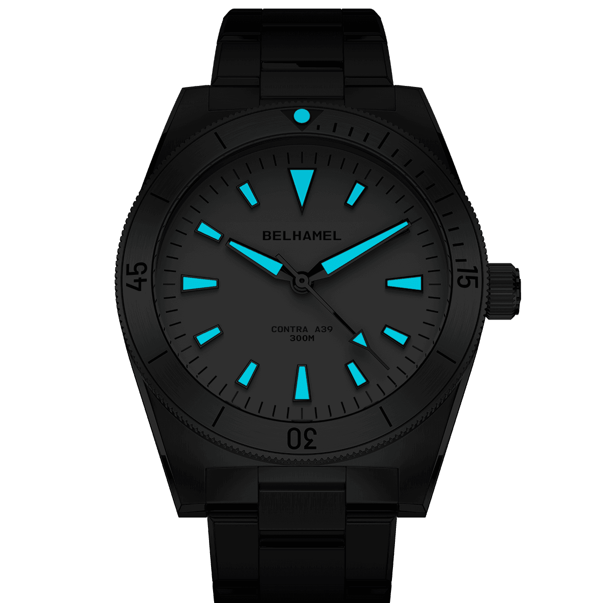 This high-performance movement is housed in a marine-grade 316-L stainless steel case with 900-1100 HV hardness and a 30 ATM depth rating. This watch can take a beating, and with its finely polished chamfers, it's equally pretty as sturdy. The Contra A39 measures 39mm in diameter, 47mm lug-to-lug, and 12mm thick, offering a balanced and comfortable fit.