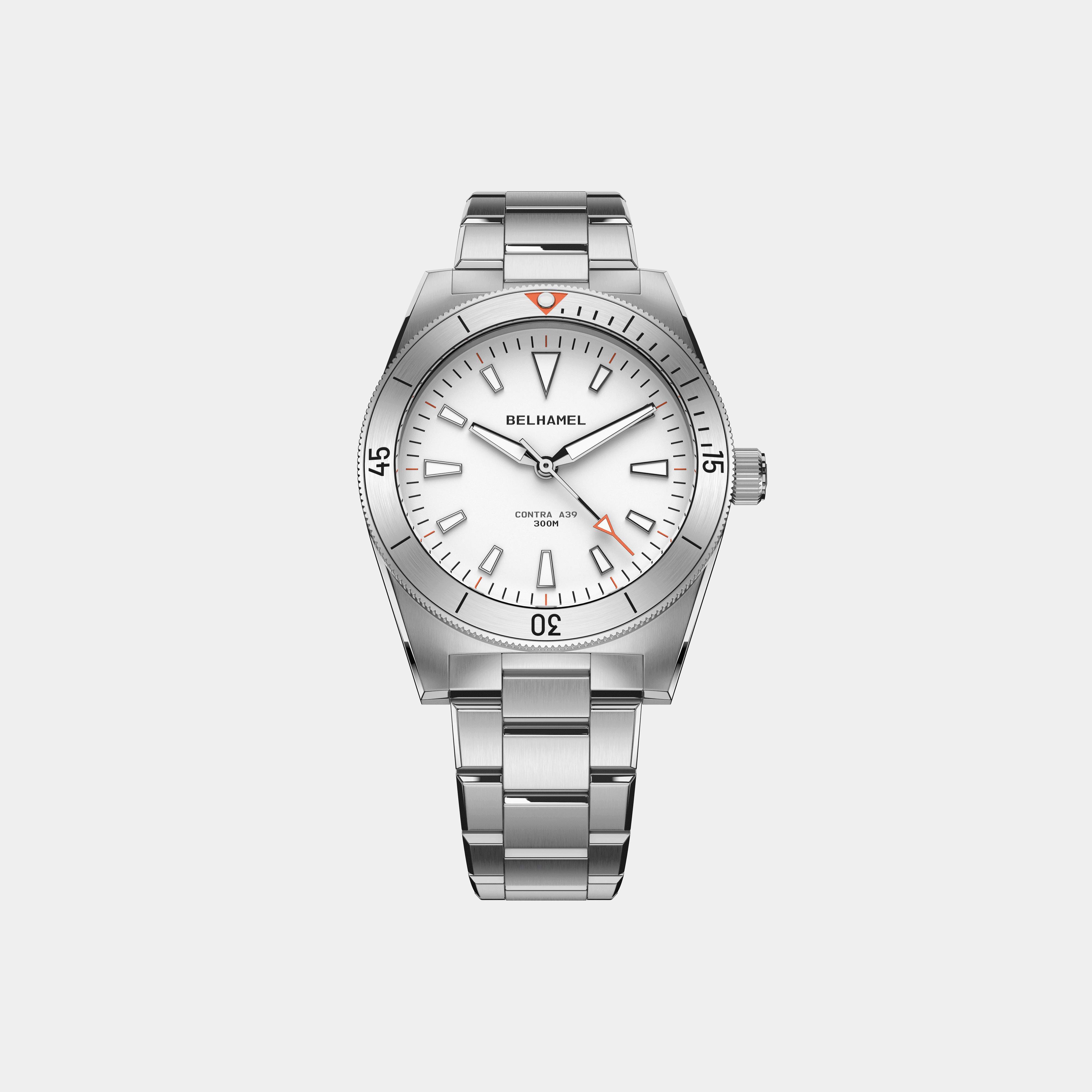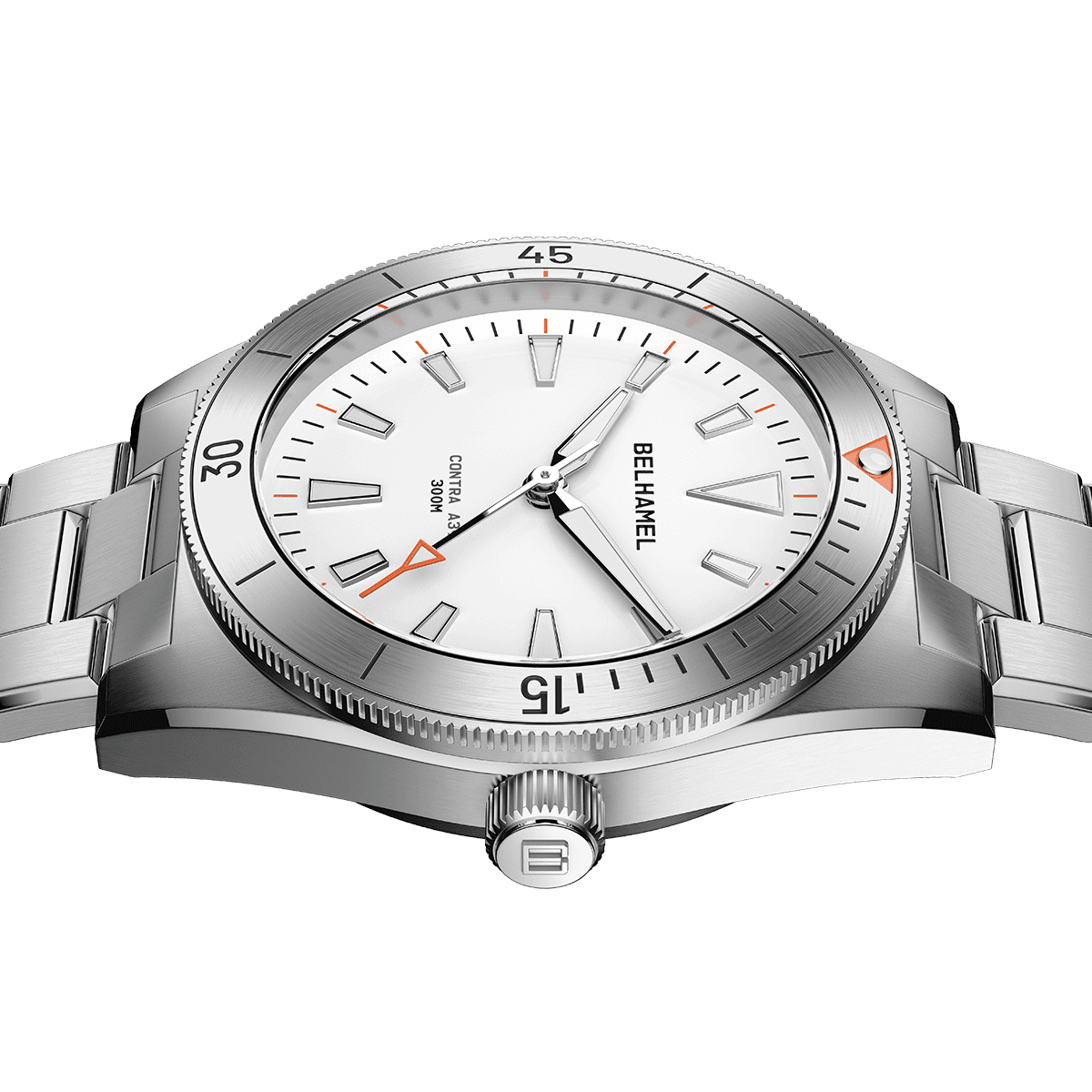 The polished diamond-cut hands align with the applied hour markers on a matte dial. In dark environments, the Contra A39 shines bright with Swiss Super-LumiNova (BGW9) lume.